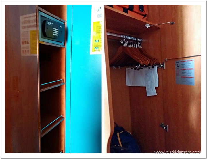 Upon entering and closing the door (the blue thing in the photo above) you are met with the cabin safe and several shelves to help you unpack and organize your items. We used the shelves for shoes and my husband stored his clothes on the rest.