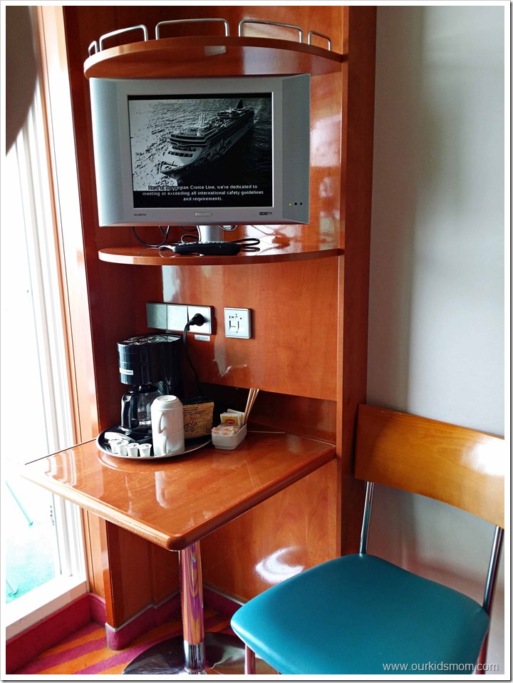 Directly across from the couch was a tiny kitchen table and chair with a 4 cup coffee maker. I welcomed this amenity as it was the first time I had this convenience on a cruise ship. Typically I’d have to call room service to get coffee while I got ready.