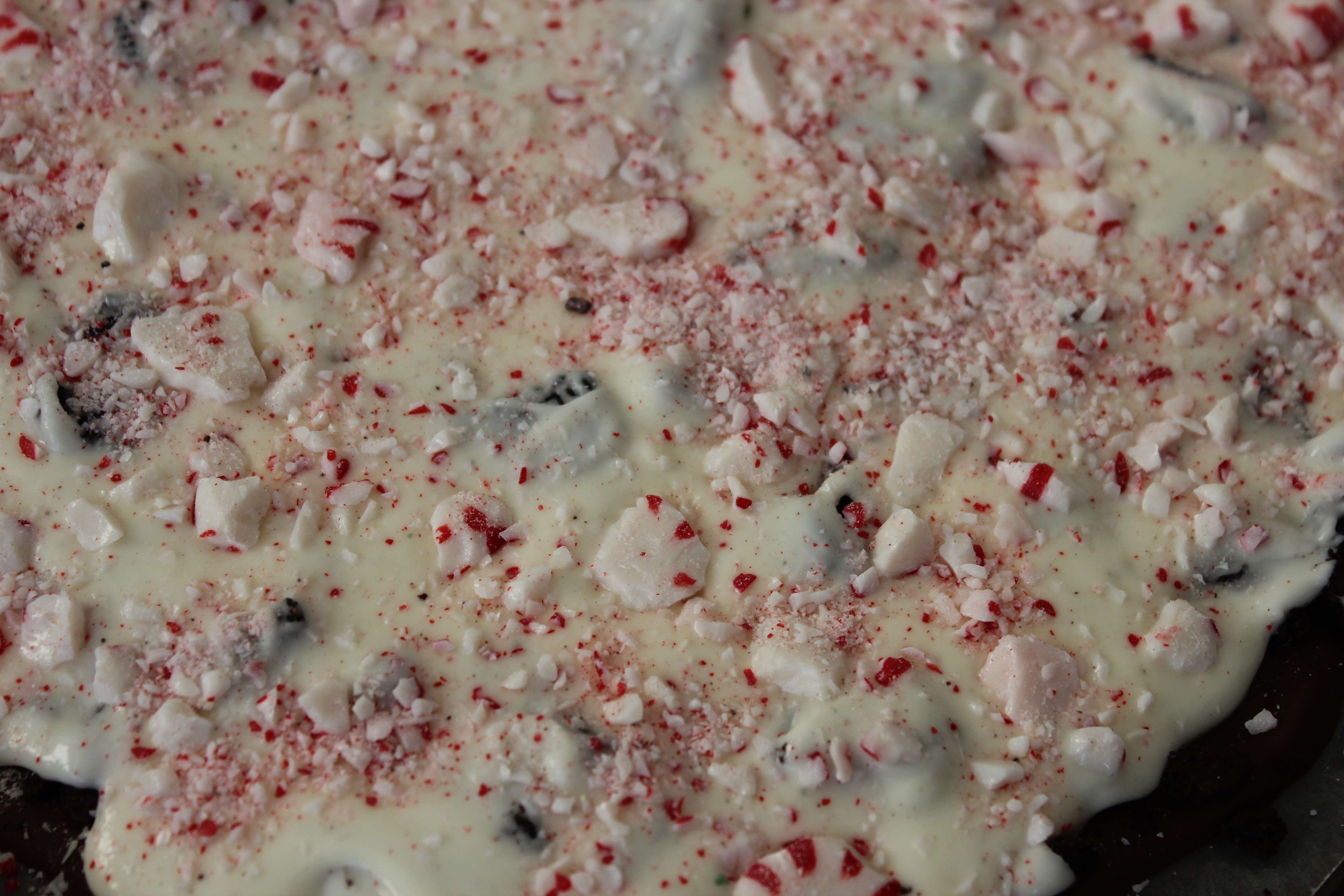 - Distribute peppermint over the white chocolate layer.