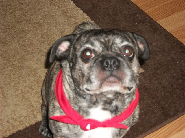Elvis is sporting the bandana he won and he is begging for more treats.