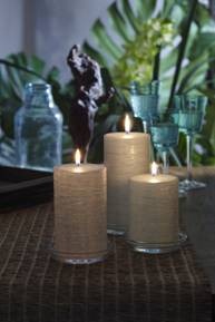 GloLites are make right here in the United States. The outer wax is richly textured, and the glow is nuanced. The experience feels genuine and organic. Each candle is individually hand-crafted, so slight variations in color and texture may occur, and no two are exactly alike. You will create the most drama by arranging these candles in odd numbers and in varied heights. They are slow burning and long-lasting, allowing you to enjoy the magic for longer than a comparable sized standard pillar candle (see below).
