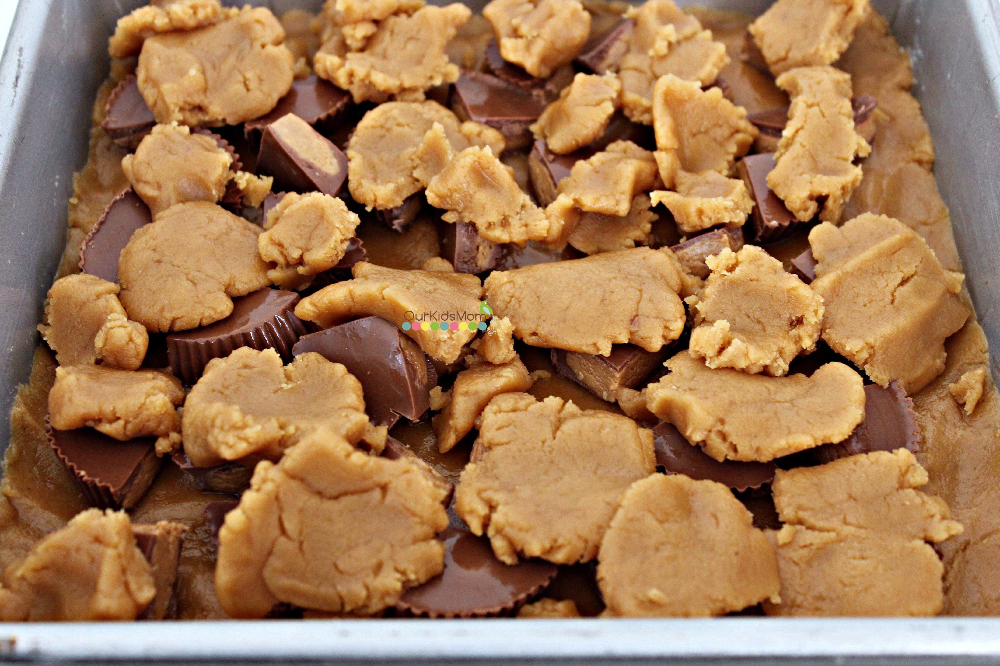 - Using a spoon, drop remaining batter on top of peanut butter cup pieces.