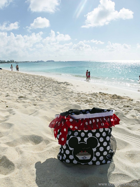 I stuffed the bag full with just about everything our family of six needed for a day on the beach in Grand Cayman. Here you can see our ship in the background as our bag soaks in the sun.