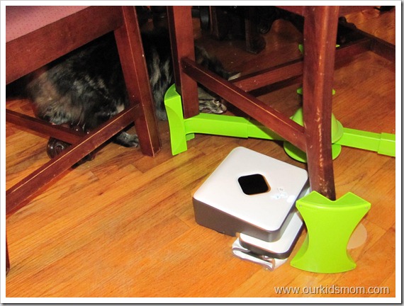 Our new Mint cleaner has intrigued our cats. This is Mocha who is using barricades to make sure he is safe while checking out this white machine that is moving around the room.