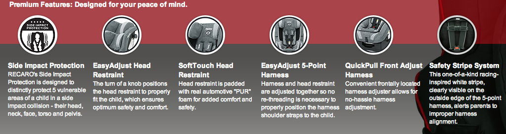 I learned that every seat is built with RECARO’s superior side impact protection technology and I like the EasyAdjust 5-Point Harness.