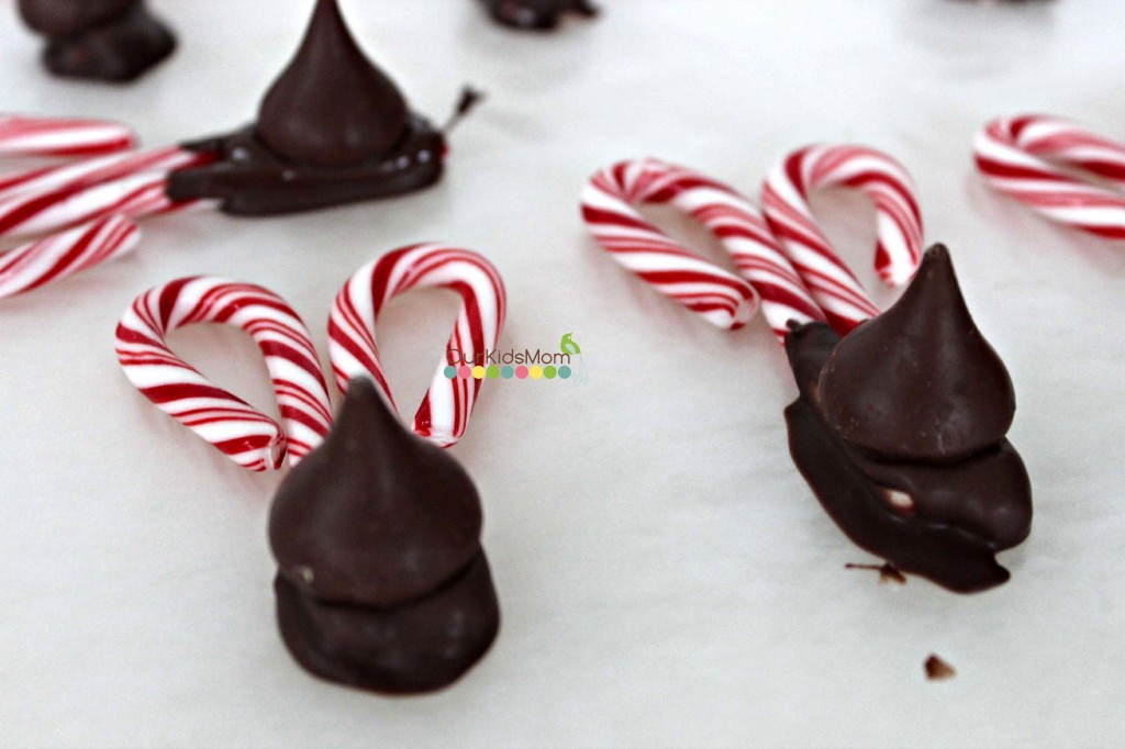 - Place an unwrapped Hershey Kiss on the chocolate covered canes.