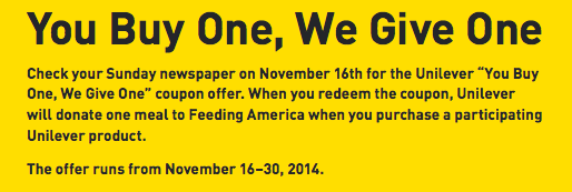 We are going to check the Sunday November 16, 2014 newspaper for the Unilever “You Buy One, We Give One” coupons. When you redeem the coupon, Unilever will donate one meal to Feeding America!