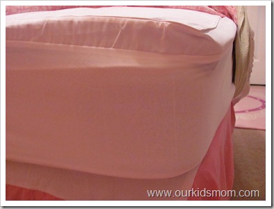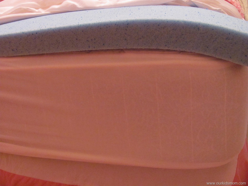 Emma was the fortunate recipient of this set, as she is the only person with a twin sized bed in the house. The topper was the same quality as the queen sized one we put on Kaytlin’s bed, but in 1.5” instead of 2.5”. Putting it on the bed is a little different, but still very simple. Place the gel-memory foam topper on the mattress and then stretch the provided mattress protector over the topper and mattress and you are done (sorry for the pink tint… Emma’s room glows pink Smile )!