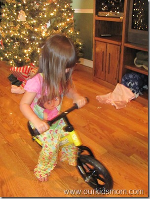 Emma’s Strider PREbike arrived just in the nick of time for Christmas. “Santa” was prepared for a night of assembly when he opened the box to find this nice surprise! The bike was only in 4 pieces! After checking out the instructions he sat down to assemble Emma’s first bike. In no time at all he had this…