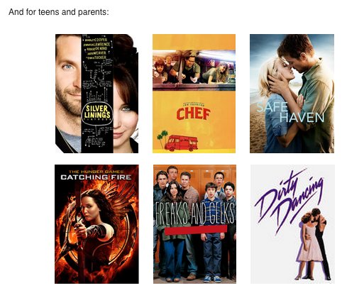 2. Chef 3. Safe Haven 4. Catching Fire 5. Freaks and Geeks 6. Dirty Dancing |