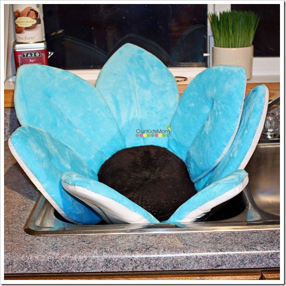 Blooming bath is deigned to lay and store flat. When it’s bath time, place it in the sink where it folds up and molds to fit snug in almost any sink. Made from a thick foam, the flower petals hold your baby snug making them feel safe and secure. My favorite part of the flower is the super soft center for your baby’s bum to sit on. Finally, no more folding towels to try and make it a little more comfortable. Having baby and mom both feeling comfortable at bath time makes for a happy relaxing experience.