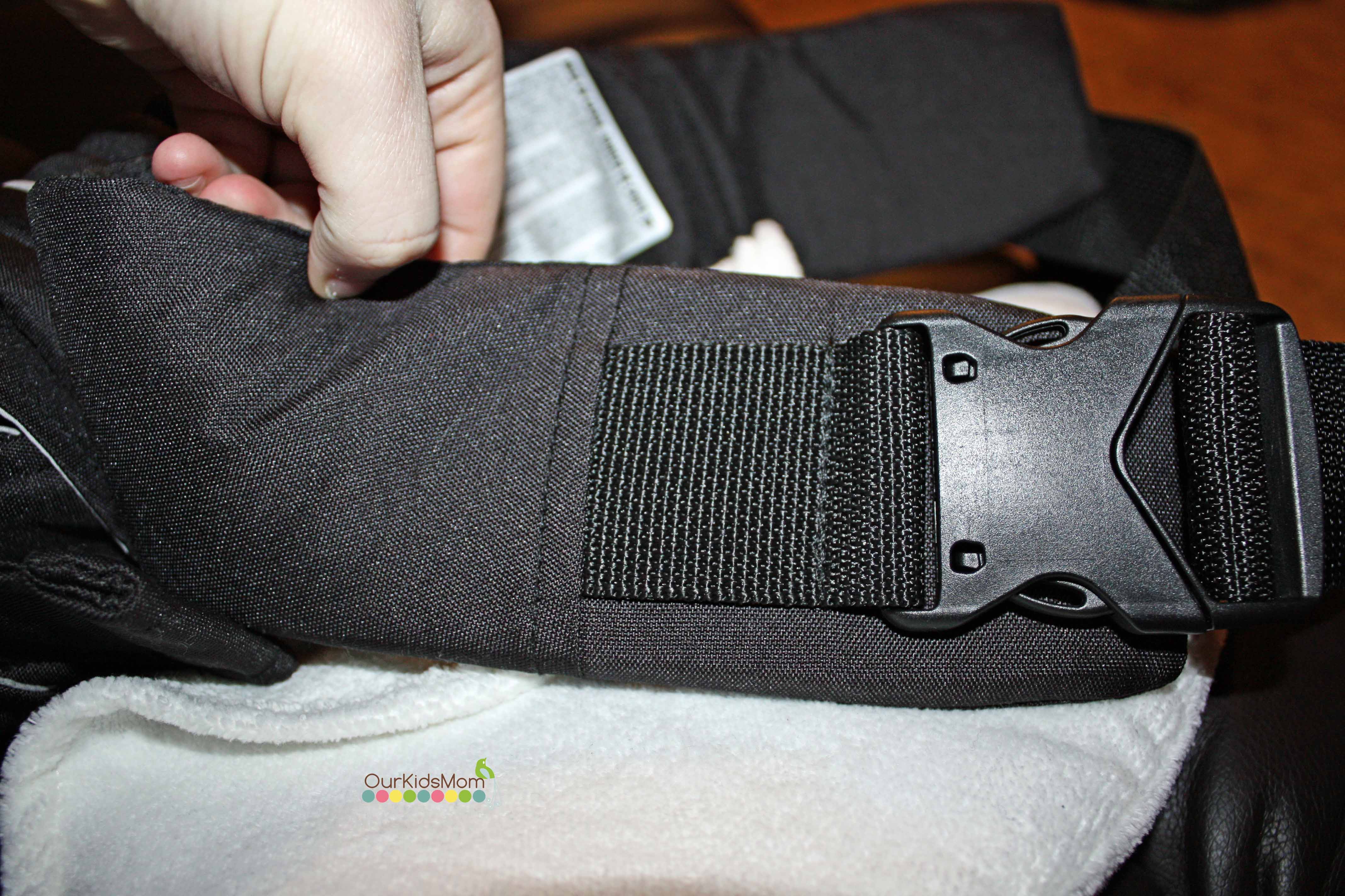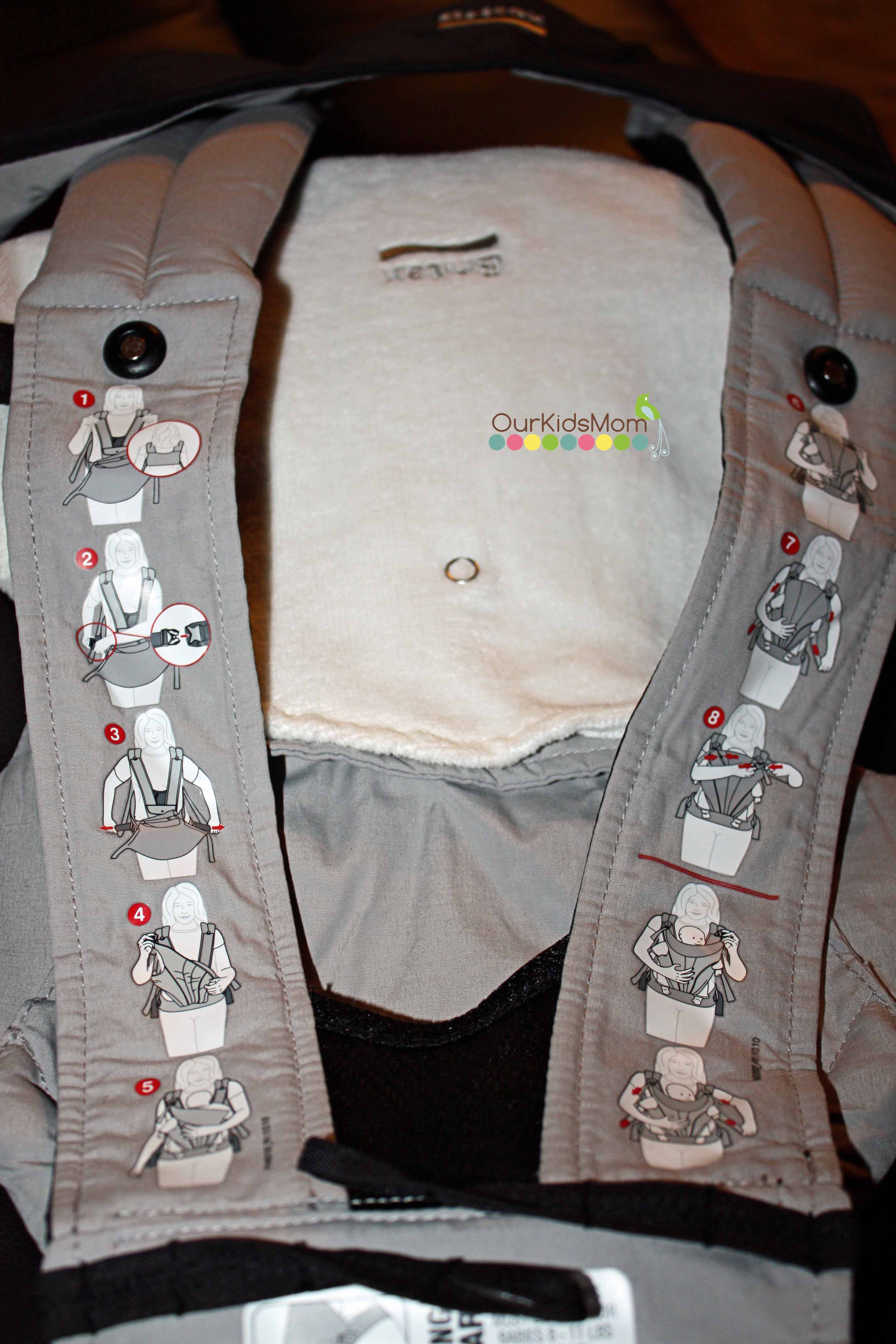 The first thing I noticed as I was about to put it on were the picture instructions printed on the inside of the padded shoulder straps. If I happen to need any reminders and don’t have the manual book, there are easy instructions right there. Placing it over my head and buckling up the waist strap I noticed how comfortable the wide padded hip strap was. It was super easy to tighten and make comfortable and snug on me. However, I did have trouble reaching the harness adjuster strap when it was fully pulled out. I actually had to ask my husband to give it a pull so I could reach the strap myself. Once on I was very comfortable wearing it… it felt snug and well proportioned on my back, shoulders, and hips.