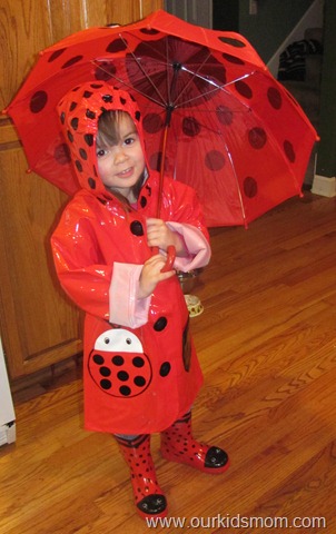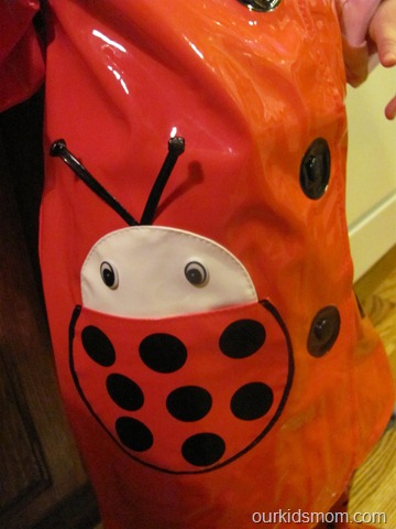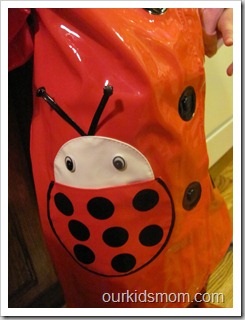 Again, I choose a couple of sizes up on the rain coat so Emma can use it for several seasons. Even “too big” the coat fits nicely. It is made of a nice thick material… definitely great quality.