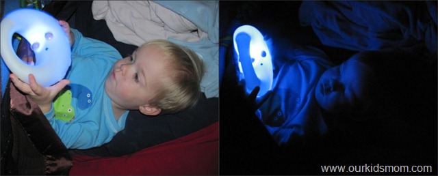 The quarter moon night light was a hit from the instant I handed it to him and turned it on. Ethan has had a problem with staying in bed lately, and his “moon light” has kept his attention long enough for him to drift off to sleep and not get out of bed and play… which makes me one happy Momma! I am loving our Kinderglo and would love to have a second one for Emma.