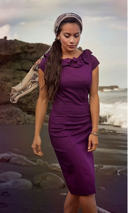 A simple shift takes on a new form with a lei of tucks, folds and petal-like ruffles along the rounded scoop neck of the Bali Hai dress. Princess seams and careful tailoring keep the shape classic, and the cap sleeves and deep orchid color make it summer’s perfect stand-alone piece.