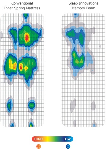 A Memory foam mattress topper placed on a conventional mattress results in far fewer areas of pressure and less pressure compared with the same conventional inner spring mattress without the topper. Memory foam reduces pressure points by evenly distributing your body weight across its surface. The push-back pressure, (shown in red) experienced with conventional innerspring mattresses, is virtually eliminated with memory foam.