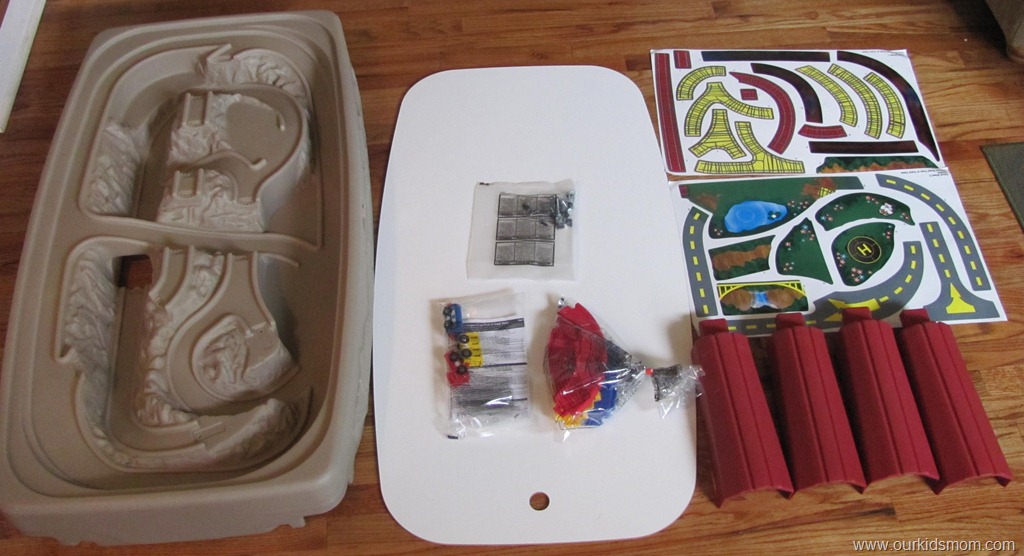 The train table arrived in just a few pieces but with plenty of screws and stickers. The directions recommend a power tool (electric screwdriver or drill) for assembly and I totally agree. It can be done without one, but your hands and wrist may bark at you later for it.